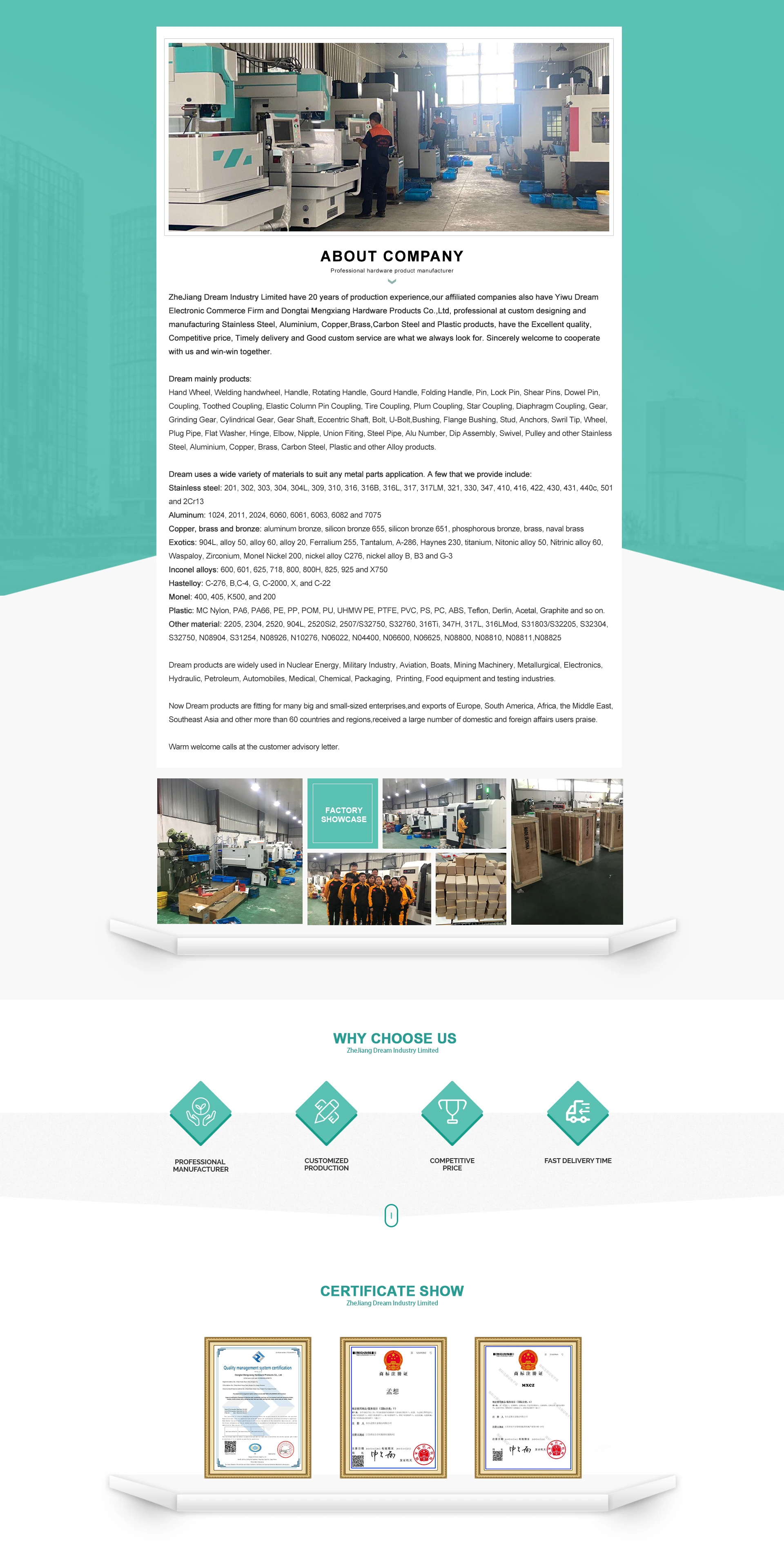 Belangrijkste producten:Roestvrijstalen handwiel, roestvrijstalen schuifpen, roestvrijstalen schuifbout, roestvrijstalen schuifbus, stalen schroefdraadfitting elleboognippel